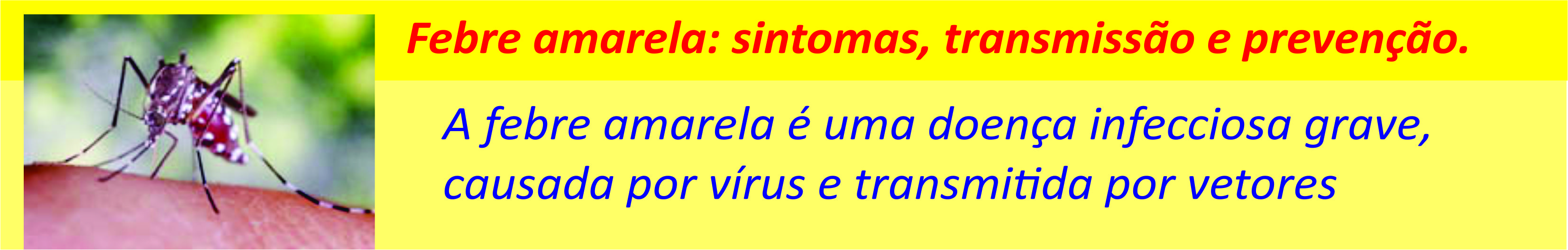 A febre amarela é uma doença infecciosa grave, causada por vírus e transmitida por vetores. Geralmente, quem contrai este vírus não chega a apresentar sintomas ou os mesmos são muito fracos. As primeiras manifestações da doença são repentinas: febre alta, calafrios, cansaço, dor de cabeça, dor muscular, náuseas e vômitos por cerca de três dias. A forma mais grave da doença é rara e costuma aparecer após um breve período de bem-estar (até dois dias), quando podem ocorrer insuficiências hepática e renal, icterícia (olhos e pele amarelados), manifestações hemorrágicas e cansaço intenso. A maioria dos infectados se recupera bem e adquire imunização permanente contra a febre amarela.